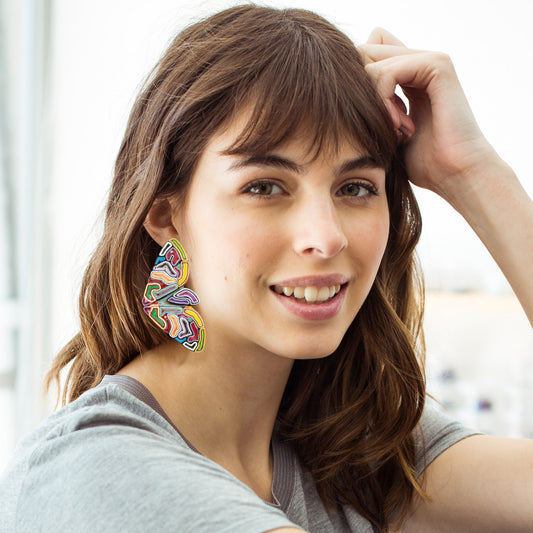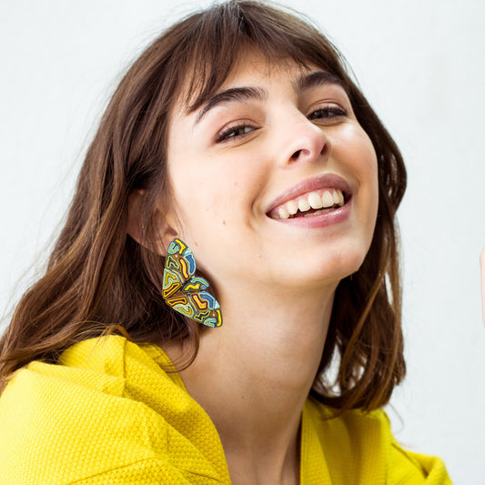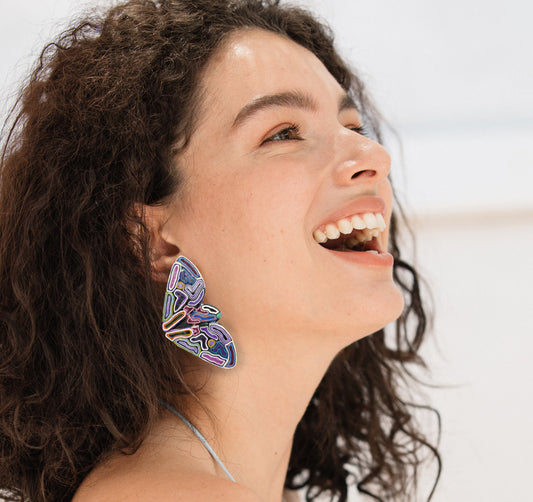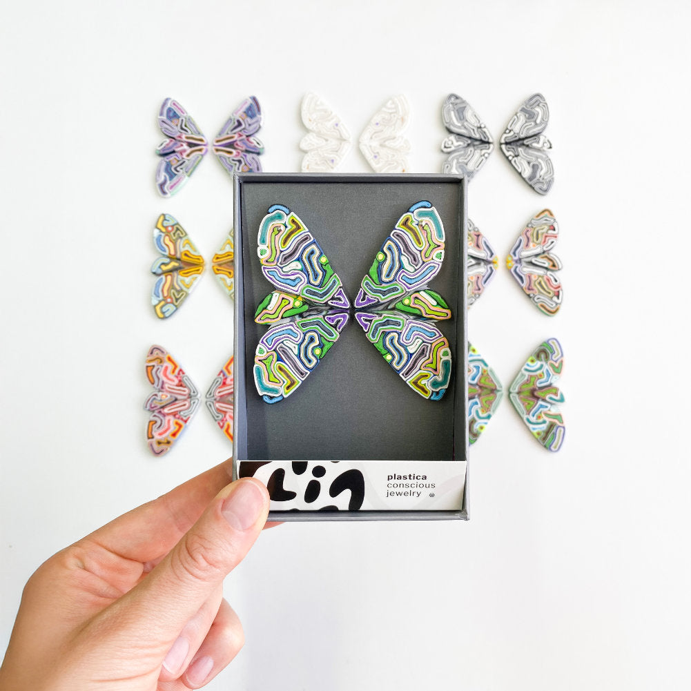 Plástico reutilizado que hoy renace convertido en algo delicado, ligero, profundamente bello. Esta no es solo una colección de joyas. Es una invitación a volar liviano; a reconocer la belleza de lo único.
