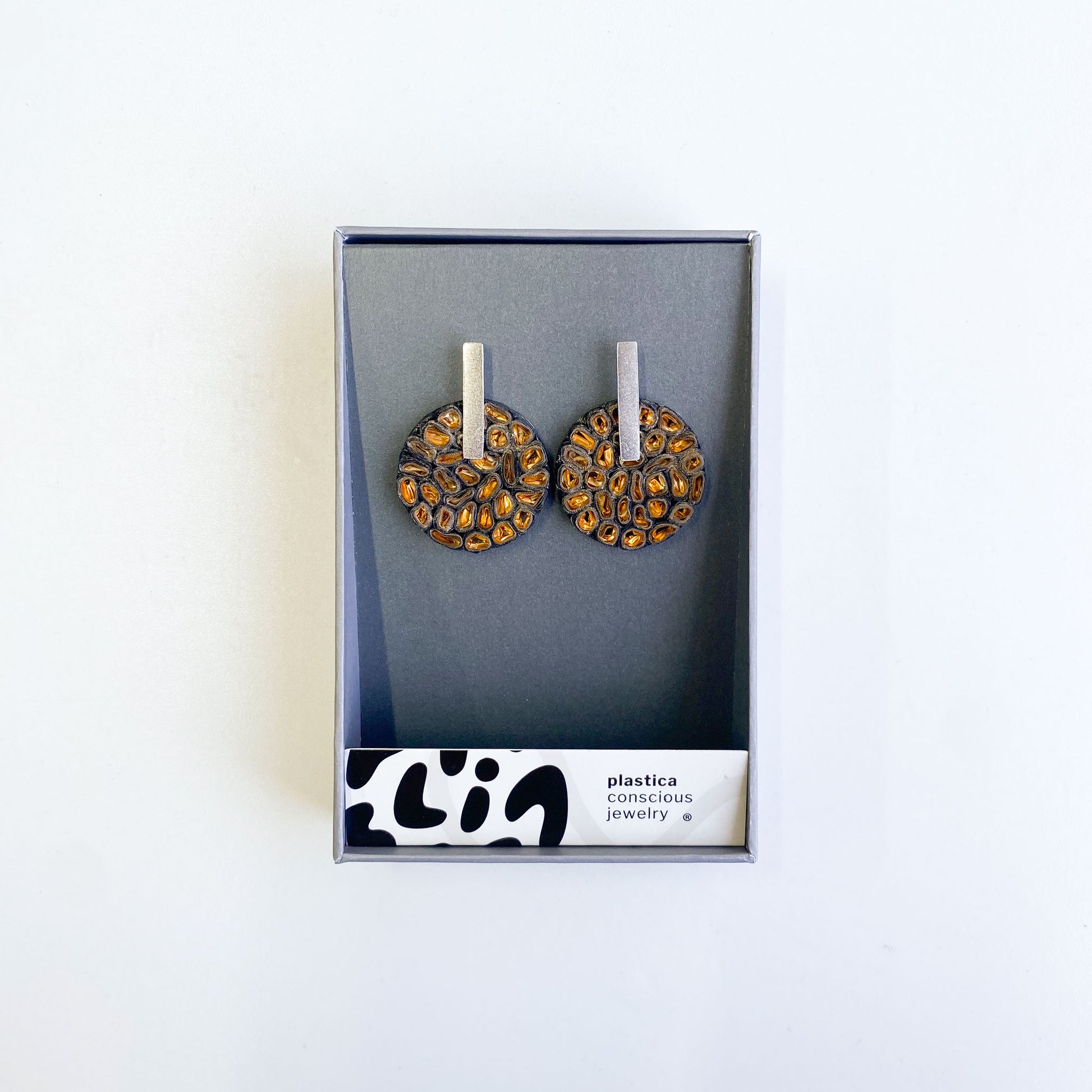 Modelo Renata, herraje de plata satinado y plástico reutilizado.